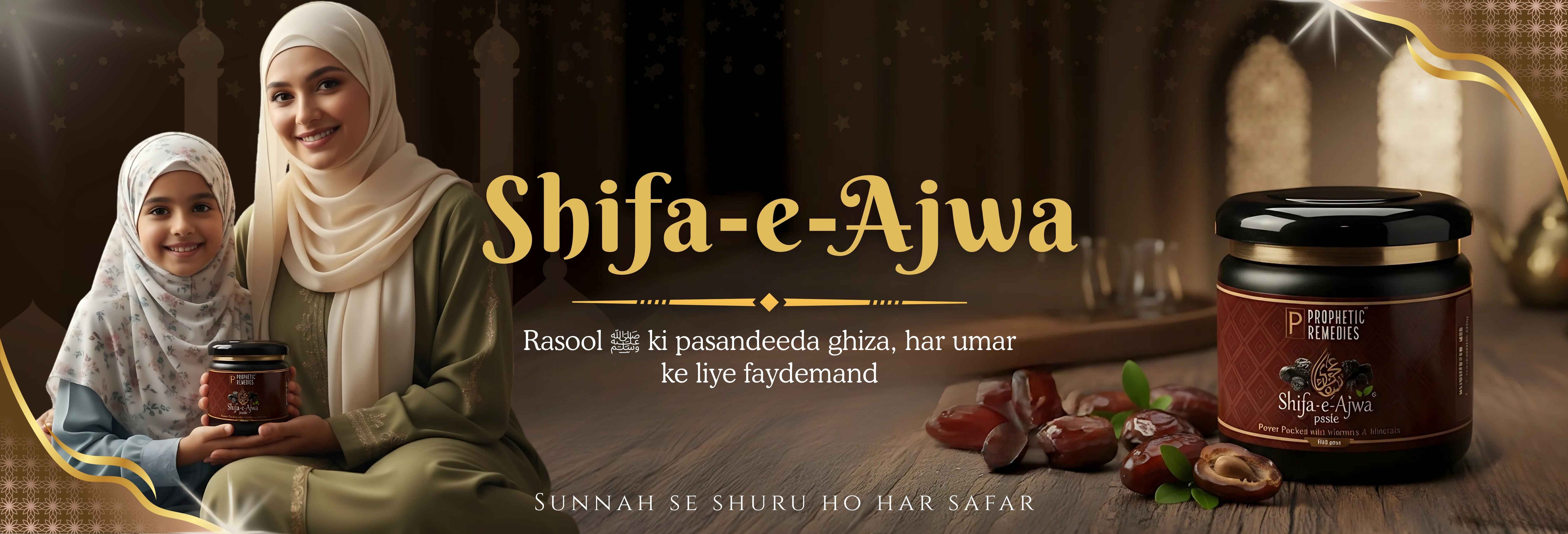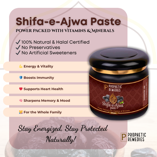 Shifa-e-Ajwa paste blends Ajwa dates, Ajwa seeds, black seed, honey, and saffron to support immunity especially in kids, echoing prophetic tradition.
